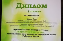 26 апрель көнне «1 Гимназия- милли белем бирү үзәгендә” татар халкының бөек шагыйре Габдулла Тукайның туган көненә багышланган “И туган тел, и матур тел” муниципаль шигырь конкурсы булып узды.Әлеге бәйгедә безнең балалар бакчасының уртанчылар төркеменә йөрүче Аиров Раяз шагыйрнең “Кызыклы шәкерт” шигырен сөйләп, 1 нче дәрәҗә дипломга лаек булды.Афәрин, Раяз!!!