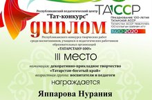 В рамках празднования 100 - летия ТАССР в республике был проведен конкурс творческих работ "Татарстану - 100!", в котором приняли участие педагоги МБДОУ №36 "Искорка" Яппарова Н.М., Файзуллина И.А., воспитатели по обучению родному языку, с работой "Гордость Елабуги - Чёртово городище" , где завоевали 3 место.