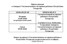 Прием граждан в Аппарате Уполномоченного по правам ребенка в Республике Татарстан/Татарстан Республикасының бала хокуклары буенча вәкаләтле вәкил аппаратының гражданнар кабул иту расписаниясе 03.07.2019