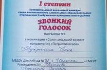 Победителем муниципального вокального конкурса среди воспитанников дошкольных образовательных учреждений Елабужского муниципального района "Звонкий голосок" стала наша воспитанница Анна Мухрыгина (музыкальный руководитель Каткова Л.С.), поздравляем, молодец!