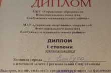 15 марта в лёгкоатлетическом манеже «Единая Россия» состоялось закрытие 1-ой региональной Спартакиады "Быстрее, выше, сильнее!" среди инструкторов по ФК и плаванию. В течение года инструкторы из Елабуги, Набережных Челнов, Нижнекамска, Мамадыша, Менделеевска и Заинска соревновались в шести видах спорта (плавание, пулевая стрельба, настольный теннис, волейбол, лыжные гонки и лёгкая атлетика). По итогам всех состязаний, команда Елабуги, в составе которой была и наш инструктор по физической культуре Андронова М.В. заняла 1-ое место! Поздравляем!