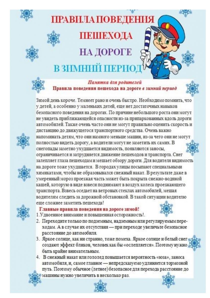 Памятка "Правила поведения пешехода на дороге в зимний период"