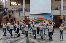 Сегодня ученическое самоуправление гимназии «Эквилибриум» в актовом зале провели для детей с ограниченными возможностями здоровья флешмоб «Мы вместе!».Бүген гимназиянең «Эквилибриум» укучылар үзидарәсе әгъзалары актлар залында сәламәтлек мөмкинлекләре чикләнгән балалар өчен «Без бергә! " исеме астында флешмоб уздырдылар. -