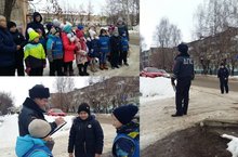 Дети из зимнего пришкольного лагеря повторяют правила дорожного движения. А помогают им в этом сотрудники дорожно-патрульной службы.
