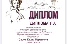 В республиканском творческом конкурсе «В созвездии А.С. Пушкина и Г.Тукая» обучающийся 1 класса Сафин Карим стал дипломантам. Так держать, Карим!