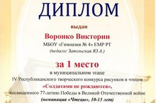 Безнең гимназия укучыларын Хуҗиәхмәтова Ильвина, Әтәкшева Мария, Воронко Виктория «солдатлар тумый»конкурсында уңышлы чыгыш ясаулары белән котлыйм. Эшләр безнең гимназияне конкурсның муниципаль һәм республика этабында лаеклы тәкъдим иттеләр, аның нәтиҗәләре буенча безнең кызлар призлы урыннар яуладылар. Педагоглар Р.М. Миңнеәхмәтовага, А. Л. Лощаковага, Ю. А. Запольскаяга башкарылган эшләре өчен рәхмәт белдерәбез. -