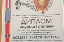 Вокальный ансамбль "Веселые ребята" стал лауреатом I степени муниципального этапа II Республиканского молодежного фестиваля-конкурса комсомольской и патриотической песни "Орлята учатся летать", посвященного 100-летию ВЛКСМ в Республике Татарстан. Руководитель Дранкова Юлия Юрьевна. Молодцы! Поздравляем!
