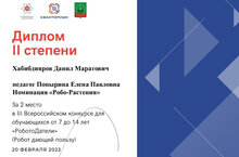 20.02.2023 елда "Робототехника" берләшмәсе укучысы Хәбибдияров Данил педагог до Попырина җитәкчелегендә "РоботоДатели" Бөтенроссия конкурсының II дәрәҗә дипломын алды.