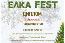 07.02.2022 " Дизайн-проектлау " берләшмәсе укучысы Ганиева Алинә, педагог Кочергина А.И. җитәкчелегендә, ЕЛКА FEST ачык республика күпжанрлы Яңа ел фестивалендә 2 дәрәҗә диплом алды.