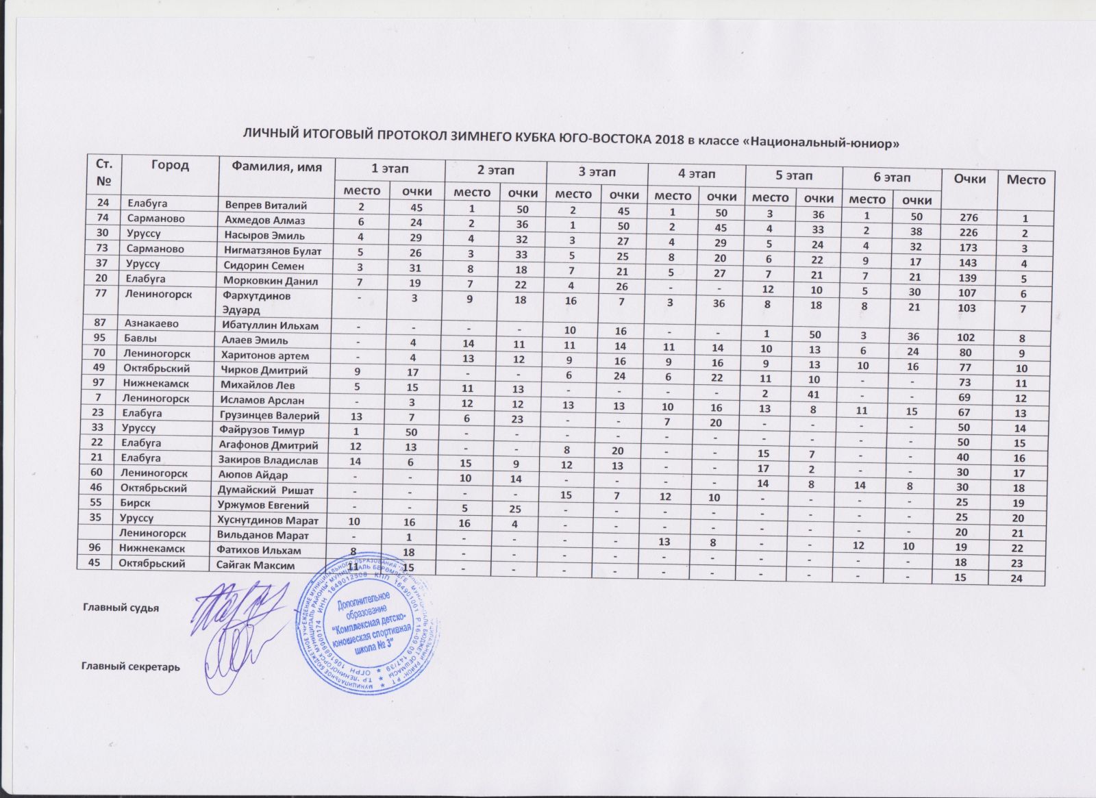 Личный итоговый протокол зимнего кубка Юго - Востока РТ 2018 в классе "Национальный-юниор"