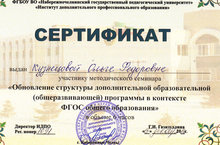 15 декабря 2016 в. г. Набережные Челны на базе Института дополнительного профессионального образования прошел методический семинар на тему "Обновление структуры ддополнительной образовательной (общеразвивающей) программы в контексте ФГОС общего образования". В данном семинаре приняла участие методист нашего Центра Кузнецова О.Ф.