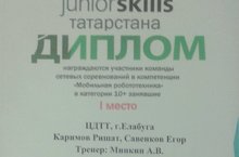 В Казани завершился масштабный трехдневный праздник профессий. 454 участника, из которых около 100 приехали из других регионов России, боролись за звание лучших молодых профессионалов. Второй год в рамках чемпионата «WorldSkills Russia» в Татарстане проходят соревнования и для школьников от 10 до 17 лет в категории Junior Skills. В компетенции "Мобильная робототехника" приняли участие учащиеся Центра детского технического творчества: Каримов Ришат, Согорин Иван, Хасанов Камиль, Софронов Дмитрий (руководитель педагог ДО Минкин А.В.) Каримов Р., Согорин И. завоевали 1 место в младшей возрастной группе (10+), Софронов Д., Хасанов К. - 2 место в старшей возрастной группе (14+). Ребят поздравил заместитель Премьер-министра Республики Татарстан - министр образования и науки Республики Татарстан Э.Н.Фаттахов, который подчеркнул важность подготовки высококвалифицированных кадров. Он отметил, что чемпионаты WorldSkills послужили развитию среднего профессионального образования, как в стране, так и в нашей республике и передал, что президент Республики Татарстан, который посетил соревнования на «Казанской ярмарке», предложил проводить чемпионат ежегодно.