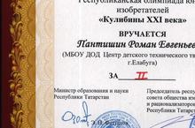 21 мая 2013 года в г.Казань прошла Республиканская олимпиада юных изобретателей "Кулибины XXI века", в которой приняли участие обучающиеся Центра детского технического творчества Гуремулта Андрей и Панчишин Роман из объединения "Прикладная электроника". Руководитель Гуремулта Владимир Васильевич.