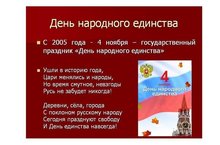 Празднование Дня народного единства по традиции заключается в проведении массовых и общественно-политических мероприятий, в том числе шествиями, митингами, спортивными мероприятиями и благотворительными акциями, возложением президентом цветов к памятнику Минину и Пожарскому, Совершением Патриархом Московским и всея Руси Божественной литургии в главном храме города Успенском соборе Московского кремля. И завершается праздник вечерним концертом