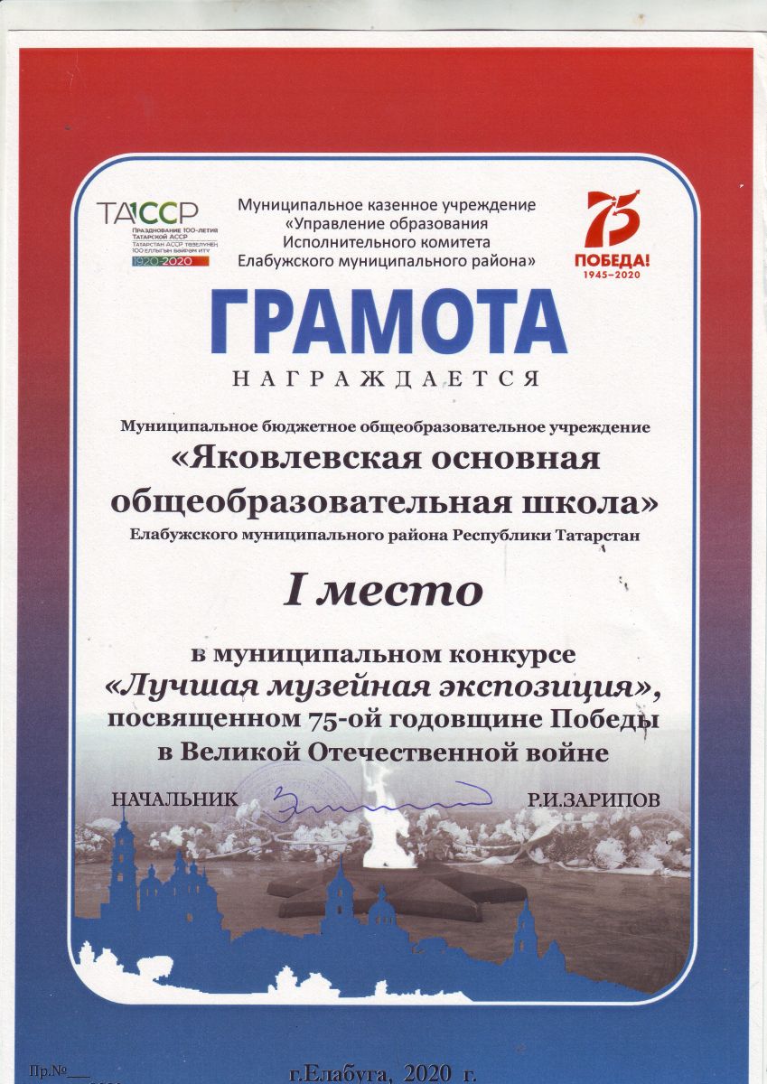 "Лучшая музейная экспозиция" муниципальный конкурс посвященном 75-ой годовщине Победы в Великой Отечественной войне. 1 место