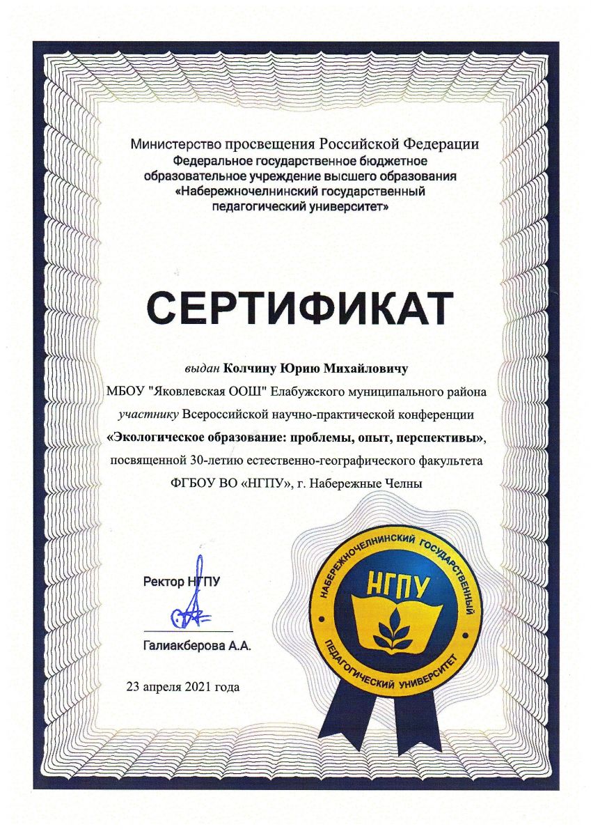 Сертификат. Музей истории села Яковлево МБОУ "Яковлевская ООШ" ЕМР является партнерм МУЗЕЯ ПОБЕДЫВсероссийская научно-практическая конференция "Экологическое образование: проблемы, опыт, перспектива" ФГБОУ ВО "НГПУ" г. Набережные Челны, 2021 год