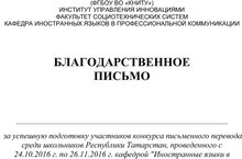 ФГБОУ ВО "КНИТУ" провел конкурс письменного перевода среди школьников РТ,проведенном с 24.11.2016-26.11.2016ю кафедрой "Иностранные языки в профессиональной коммуникации",где наша ученица 10 класса получила сертификат,руководитель благодарственное письмо.