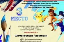 Шимановская Анастасия, ученица 3 класса, заняла 3 место за участие в Республиканском конкурсе "Мультяшные истории".