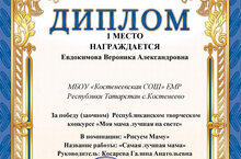 Евдокимова Вероника, ученица 5 класса заняла 1 место в Республиканском творческом конкурсе Моя мама лучшая на свете". Конкурс проводился с целью возвысить ценности материнства и любви к самому близкому человеку - Маме. / Евдокимова Вероника, 5нче сыйныф укучысы Минем әнием дөньядагы иң яхшы дигән республика иҗади конкурсында 1нче урынны алды". Бәйге иң якын кешегә-әнигә карата аналык һәм мәхәббәт кыйммәтләрен күтәрү максатыннан үткәрелде.
