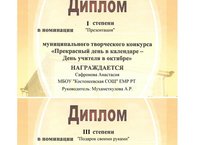 Дипломы 1 и 3 степени в муниципальном творческом конкурсе "Прекрасный день в календаре-День учителя в октябре". Руководители: Мухаметкулова А.Р. и Сёмина Э.А.\"Календарьда Гүзәл көн-октябрьдә Укытучылар көне"муниципаль иҗади конкурсында 1 һәм 3 дәрәҗә дипломнар. Җитәкчеләр: Мөхәммәткулова а. р. һәм Семина Э. А.