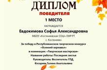 Евдокимова Софья, ученица 5 класса заняла 1 место в Республиканском творческом конкурсе "Осенний карнавал". / Евдокимова Софья, 5нче сыйныф укучысы "көзге карнавал"республика иҗади конкурсында 1нче урынны яулады.
