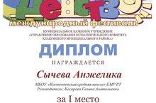 Ученица 4 класса Сычева Анжелика заняла 1 место на муниципальном этапе литературного конкурса литературных произведений "Хрустальная роза" в рамках 24 Международного фестиваля "Детство без границ" в номинации "Поэзия".Конкурс направлен на популяризацию литературного творчества и духовных ценностей среди подрастающего поколения, формирование патриотического сознания, миротворческой идеологии, активной гражданской позиции у подрастающего поколения на основе традиций и истории России, вовлечение детей и подростков в литературно-развивающую, культурно-просветительскую и творческую деятельность\Сычева Анжелика "Чиксез балачак" 24 халыкара фестивале кысаларында "Хрустальная роза" әдәби әсәрләр конкурсының муниципаль этабында "Поэзия" номинациясендә 1 урын яулады. Конкурс үсеп килүче буын арасында әдәби иҗатны һәм рухи кыйммәтләрне популярлаштыруга, патриотик аң, тынычлык идеологиясе булдыруга, үсеп килүче буын арасында Россия традицияләре һәм тарихы нигезендә актив гражданлык позициясенә, балалар һәм яшүсмерләрне әдәби-үстерү, мәдәни-агарту һәм иҗади эшчәнлеккә җәлеп итүгә юнәлдерелгән.