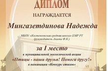 Ученица 6 класса Мингазетдинова Надежда и Сычева Анжелика заняли 1 место в муниципальном конкурсе «Птицы - наши друзья! Помоги другу!» Поздравляем!\6 класс укучысы Мингазетадинова Надеждаһәм Сычев Анжеликны алдылар “Кошлар - безнең дуслар! Дустыңа ярдәм ит!» Котлыйбыз!