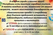 В каждом городе и посёлке нашей Республики есть поистине народные учителя.В памяти каждого из нас, независимо от нашего возраста, живет неиссякаемая благодарность им.«Комсомольская правда» к очередному Дню Учителя предлагает вспомнить и поблагодарить любимых наставников прошлого и настоящего.ОТПРАВЬ фото и рассказ о любимом учителе до 15 сентября на почту nbelovakp@gmail.comГОЛОСУЙ на сайте KAZAN.KP.RU за понравившегося участника с 15 по 30 сентября .В конкурсе будет определено три Победителя. Именно они получат подарки от партнера конкурса- сети книжных магазинов «Дом Книги»1 место- сертификат на сумму 1 000 руб;2 место- сертификат на сумму 500 руб.;3 место – сертификат на сумму 500 руб.Самые лучшие рассказы и фото будут опубликованы в газете «Комсомольская правда»!Информацию об организаторе мероприятия, сроках, правилах, подарках и сроков их получения уточняйте по телефону 226-05-05 и на сайте kazan.kp.ru/Республиканың һәр шәһәрендә һәм Бистәсендә чын-чынлап халык укытучылары бар. Безнең һәркайсыбызның хәтерендә, нинди яшьтә булуына карамастан, аларга бетмәс-төкәнмәс рәхмәт яши. » Комсомольская правда " укытучыларның чираттагы көненә узган һәм бүгенге көндәге яраткан остазларына рәхмәт әйтергә тәкъдим итә. Яраткан укытучысы турында 15 сентябрьгә кадәр почтага фото һәм хикәя җибәр nbelovakp@gmail.com Сайттагы тавыш бир KAZAN.KP.RU 15-30 сентябрь көннәрендә ошаган катнашучы өчен . Конкурста өч җиңүче билгеләнәчәк. Нәкъ менә алар конкурсның партнеры - «китап йорты " китап кибетләре челтәре исеменнән бүләкләр алачак» 1 урын-1000 сумлык сертификат; 2 урын-500 сумлык сертификат.; 3 урын-500 сумлык сертификат. Иң яхшы хикәяләр һәм фотолар «Комсомольская правда»газетасында басылып чыгачак. Чараны оештыручы, вакыты, кагыйдәләре, бүләкләре һәм аларны алу сроклары турында мәгълүматны 226-05-05 телефоны буенча һәм сайтта ачыклагыз kazan.kp.ru -