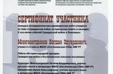 Сертификат участника конкурса исследовательских краеведческих работ по теме "Гражданская война: историческая память и наследие.К 100-летию событий Гражданской войны в Поволжье Мингазетдинова Богдана -ученика 6 класса/Гражданнар сугышы: тарихи хәтер һәм мирас темасы буенча туган якны өйрәнү эшләре конкурсында катнашучы сертификаты.Идел буенда Гражданнар сугышы вакыйгаларының 100 еллыгына-6 нчы сыйныф укучысы Мингазетдинов Богдан