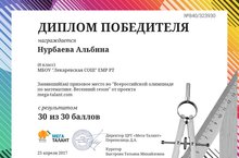 Нурбаеву Альбину, ученицу 8 класса,Тухватуллину Аделину, ученицу 5 класса,с победой во «Всероссийской олимпиаде по математике. Весенний сезон» от проектаmega-talant.com -