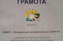 Наша школа награждена грамотой за активное участие в муниципальной природоохранной акции «Зимующие птицы». Благодарим всех учеников, учителей и родителей за участие в данной акции!