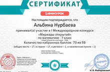 22 марта 2016 г. состоялся І Международный online конкурс по математике «Мириады открытий», в котором приняла участие ученица 7 класса Нурбаева Альбина. В результате она заняла І место в регионе. Поздравляем! -
