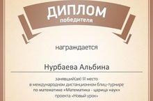 Поздравляем Нурбаеву Альбину, ученицу 7 класса, с победой в Международном дистанционном блиц - турнире по математике «Математика – царица наук» проекта «Новый урок», который проводился с 10.02.2016 по 17.02.2016 г. -
