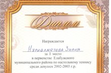 Нуриахметова Зилия - ученица 7 класса заняла 1 место в первенстве ЕМР по настольному теннису среди девушек 2002-2003г.р.