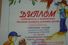 Подведены итоги конкурса "Зеркало природы - 2012. Все участники нашей школы награждены дипломами в номинациях "Зелёная планета глазами детей", "Поделки из природного и вторичного материала", "Жизнь леса и судьбы людей". Желаем дальнейших творческих успехов!