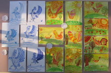 Символ наступающего нового года – Петух. Он представлен в работах подготовительного класса (преподаватель Архипова С.Г.) в двух кардинальных образах: «холодный» и спокойный в стиле гжельской росписи, а так же яркий и динамичный акварельный петушок.