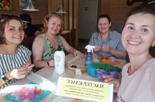 Как с пользой провести отпуск елабужанам и гостям нашего города знает преподаватель Детской художественной школы №2 Салимова А.М. В городском кафе "До-до пицца"" в рамках творческого проекта "ART - Skameika" прошел мастер-класс "Летняя салфетка" в технике мокрого валяния. Участники мастер-класса получили массу приятных впечатлений и навыков в старинном ремесле валяние из шерсти.