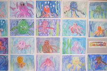 Океанской глубине.Учащиеся подготовительного класса (дети 6 лет - преподаватель Столярова Г.Р.) нарисовали очаровательных осьминожек, которые украшают выставку в фойе школы.