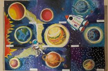 Оригинальную коллективную работу ко Дню космонавтики сделали учащиеся Б3 класса под руководством преподавателя Гимаевой Регины Мунавировны. Выставку "Полетели" можно увидеть в галерее детского творчества "Жираф".