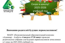 МАОУ «Полилингвальный образовательный комплекс «Адымнар – Алабуга» 4 июля в 17.30 минут проводит родительское собрание для будущих первоклассников зачисленных в 1 класс на 2025-2026 учебный год. Вход в школу строго по документам. Бахилы обязательно.