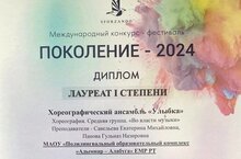 I дәрәҗә лауреаты, өлкән төркем «Менә шәп!» биюе белән II дәрәҗә лауреаты исеменә лаек булдылар. Яшь талантларыбызны котлыйбыз һәм яңа иҗади җиңүләр телибез!Хореографический ансамбль «Улыбка» принял участие в Международном конкурсе - фестивале «Поколение 2024»