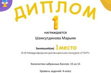 В целях развития творческих способностей школьников, повышения уровня знаний и стремления к достижению высоких результатов, ученики ЧОУ «Средняя общеобразовательная школа «Ихсан» приняли участие VII Международном дистанционном конкурсе "СТАРТ". Шамсутдинова Марьям, ученица 4 класса, набрав максимальное колиство баллов, заняла I место. Молодец. Поздравляем!
