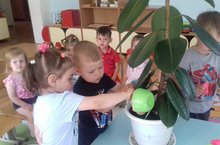 Хрюша безгә бурыч куйды , фикусны исенә төшереп, тузаннан төчкерә башлады.Ул балаларга яхшы эш эшләргә, фикусның яфракларын тузаннан сөртеп алырга тәкъдим итте. Балалар бик теләп фикуска су сиптеләр һәм бүлмә үсемлегенең яфракларын тузаннан сөртеп алдылар.