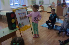 29 декабря 2016 г. прошло знакомство с литературным произведением по БДД. После обсуждения стихотворения дети средней группы №3 узнали, что на проезжей части играть нельзя и переходить дорогу по пешеходному переходу, что тротуар проходит вдоль дороги. Во время подвижной игры «Светофор» дети выполняли движения по сигналу ведущего.