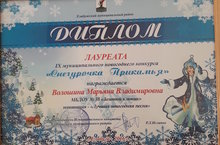 Диплом лауреата IX муниципального новогоднего конкурса «Снегурочка Прикамья» награждается музыкальный руководитель Волошина Марьяна Владимировна МБДОУ «ЦРР-детский сад №38 «Золотой ключик», в номинации «Лучшая новогодняя песня»