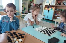 Замечательное средство формирования гармоничной личности дошкольника - это настольные игры. Наши дети старшей группы очень любят играть в шашки. Шашки - это не просто интересная игра, позволяющая увлекательно провести свободное время, а также эта игра совершенствует логическое и абстрактное мышление.Воспитывает самостоятельность в принятии решений.Развивает память и пространственное воображение. Данная игра предполагает совместную детскую деятельность, поэтому способствует социализации, развитию навыков общения, приучает дошкольников доброжелательно относиться друг к другу.