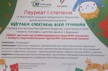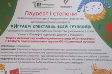 39 нчы "Киләчәк" балалар бакчасы МБМББУнең 3 нче төркем балалары "Татнефть һәм балачак" проекты кысаларында үткәрелгән "Бөтен төркем белән спектакль уйныйбыз" исемле мәктәпкәчә яшьтәге балаларның театр иҗаты фестиваль-бәйгесендә 1 нче дәрәҗә лауреат булдылар.