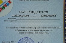 12 апреля проходили городские соревнования среди воспитанников ДОУ "Прикоснись к природе сердцем...", посвященные Году экологии. Участвовали дети старших групп. Было очень увлекательное, интересное мероприятие. Дети с огромным удовольствием участвовали в состязаниях. Старшая 9 группа нашего детского сада заняла почетное 1 место. Поздравляем!!!