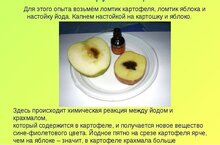 Today we conducted an experiment with the guys on the detection of starch in products. The most popular way to determine starch in foods is to add a drop of iodine to the product. If starch is present in the product, the drop turns blue, if there is no starch, it remains unchanged.