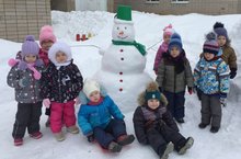 Теперь наш славный Снеговик дарит детям улыбку, встречает детей на прогулку и провожает их, создаёт хорошее настроение.